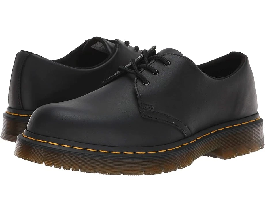 The Dr. Martens® 1461 SR work shoe offers a supportive, anti-fatigue design that has the ideal combination of lightweight durability, flexibility, and comfort to keep you moving with confidence throughout your workday. SKU: #9091866Ideal work shoes for working in restaurants, kitchens, or standard service industry workplaces. Water-resistant industrial leather upper is spill-resistant and can be easily wiped clean.Includes heritage Docs DNA like yellow welt stitching, three eyelets, and a grooved air-cushioned sole. Traditional lace-up closure with sturdy fabric laces and metal eyelets for a secure fit.Padded collar and tongue.Soft toe meets ASTM F2892-11 EH (Electrical Hazard) safety standard.Goodyear® welt construction where the upper and sole are heat sealed and sewn together for excellent flexibility and durability.Breathable textile lining. Enhanced ergonomic textile footbed provides incredible comfort via breathable, moisture-wicking SoftWair™ sock liners and strategically placed memory foam pods. Re-engineered air-cushioned outsole that is PVC-fused with central GRIP-TRAX™ rubber pods for an enhanced grip and next-level slip resistance. that meets ASTM F1677-2005 safety standard.Sole is heat-resistant to 300ºF. Imported.Product measurements were taken using size UK 11 (US Men’s 12), width Medium. Please note that measurements may vary by size.Weight of footwear is based on a single item, not a pair.Measurements: